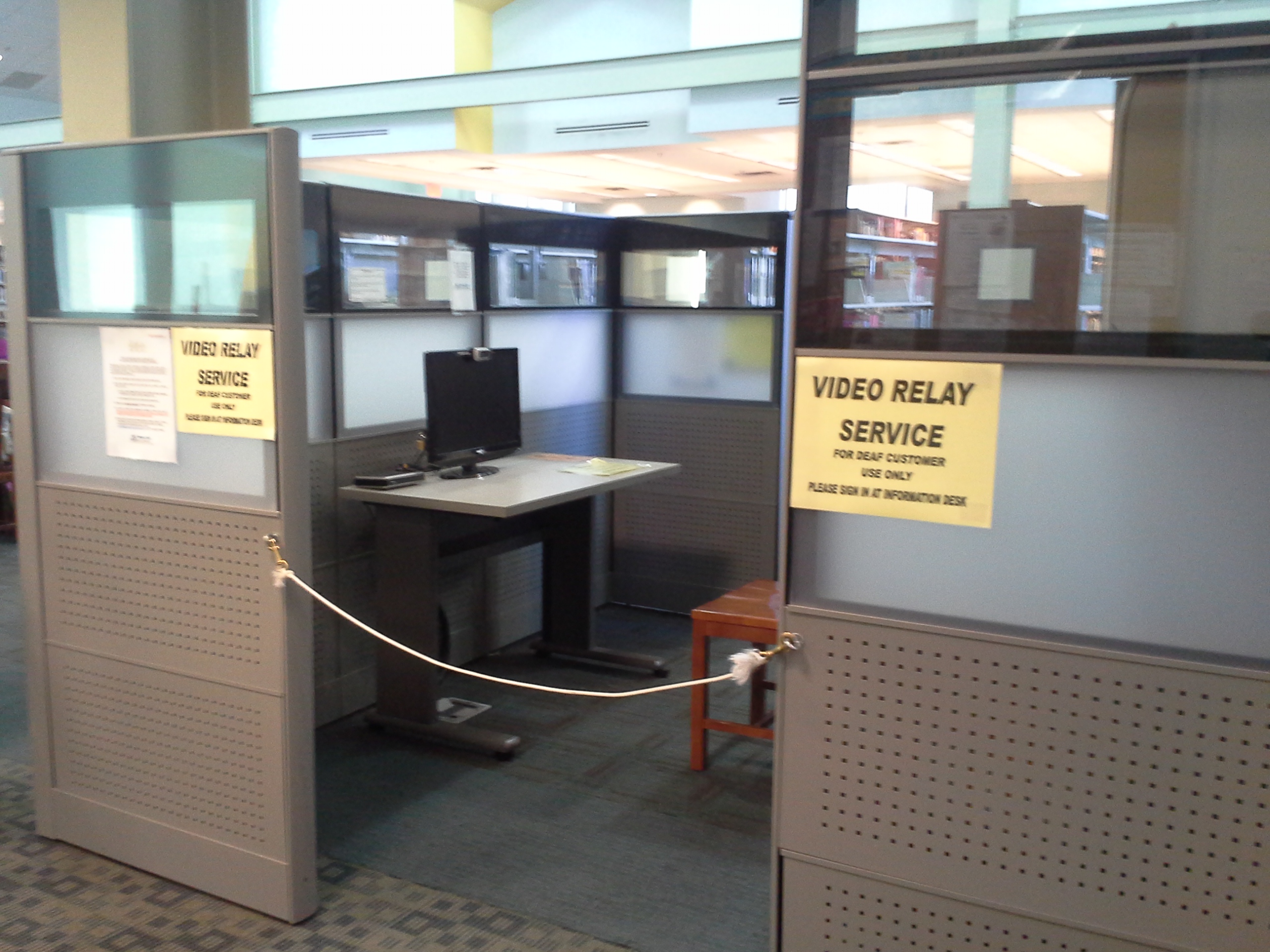 More and more libraries are offering videophone services for Deaf patrons! These technology set-ups allow Deaf patrons to make calls to other videophone users and/or access Video Relay Services to make phone calls to hearing people. Check out the set-up at the Germantown Library in Montgomery County, MD: